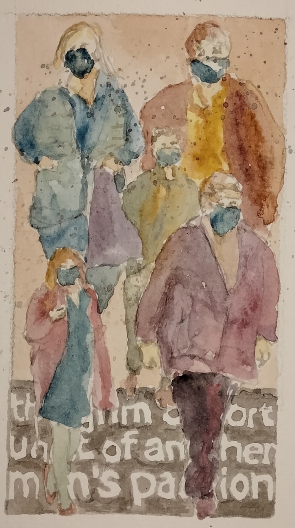 Various persons of differing proportions wearing masks and walking towards the viewer over words.